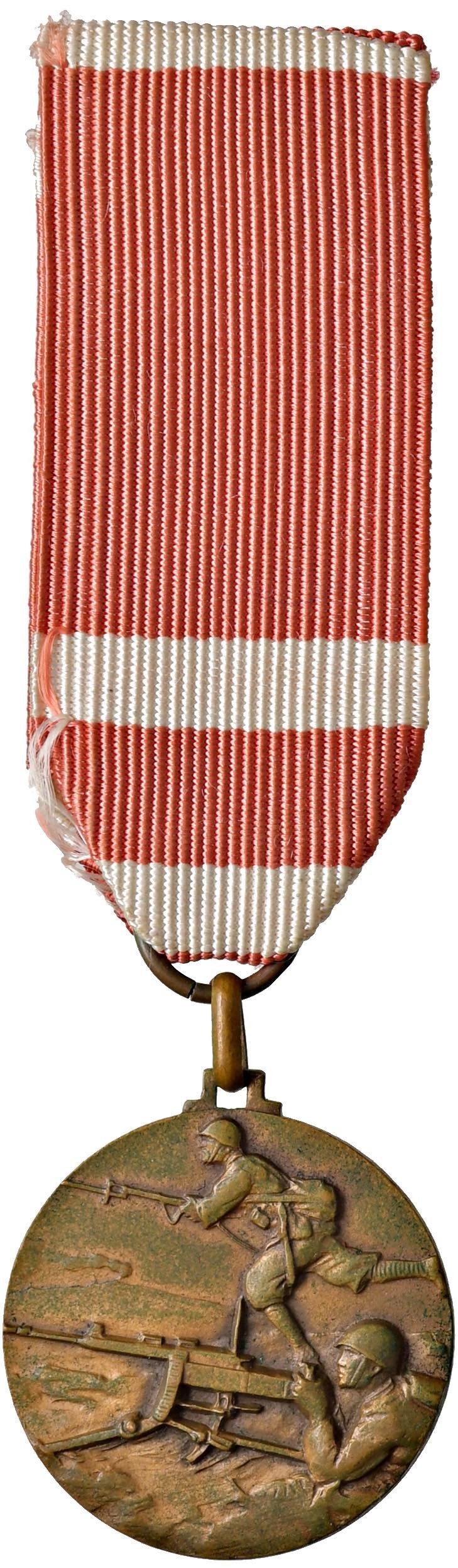 Comando I° Armata -C79 Dritto: TUTTI ALL'ALPI... _ TUTTI ALL'ARMI figura allegorica dell'Italia, elmata, paludata e drappeggiata, in piedi e volta a dx, regge scudo Savoia e spada, sullo sfondo montagne fascio e torcia tra rami d'alloro e quercia; sullo sfondo baionette inclinate a sx | |