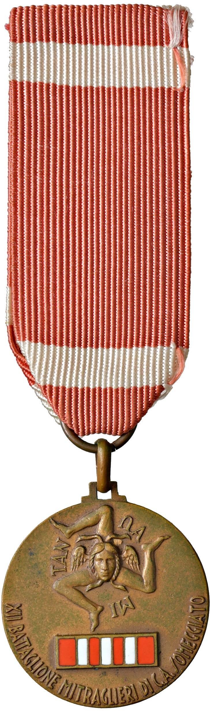 XII Battaglione Mitraglieri -C- Dritto: Mitragliere e Fuciliere elmati, in azione verso sx, sullo sfondo monti Verso: XII BATTAGLIONE MITRAGLIERI DI C. A. SOMEGGIATO fregio in quattro nastri verticali a smalti rossi alternati a tre nastri bianchi, sormontato da trinacria | |