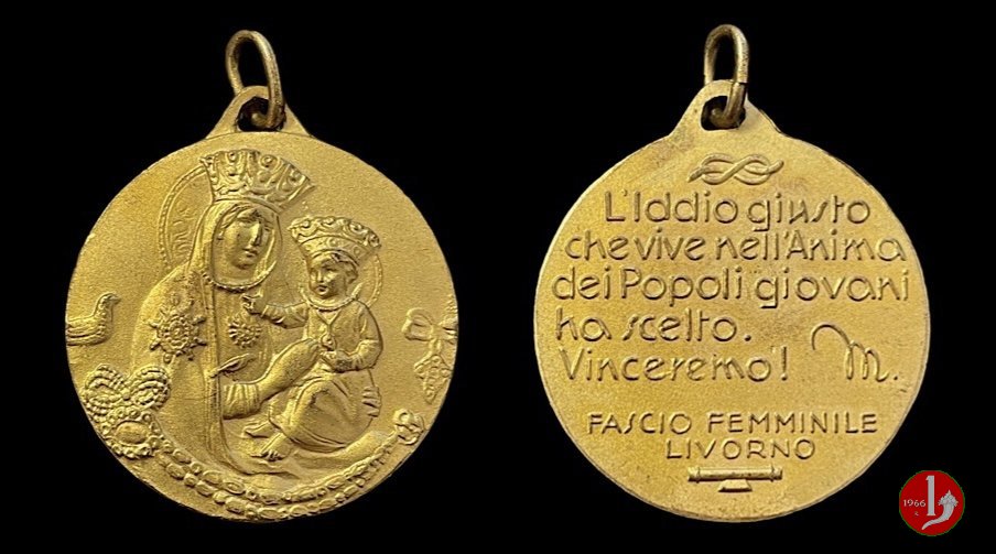 Fascio Femminile Livorno -C54 Dritto: tra Croce e colomba: busto della B. V. Maria col Bambino coronati e nimbati, di fronte e sopra a collana Verso: nel campo: (nodo Savoia) = L'IDDIO GIUSTO = CHE VIVE NELL'ANIMA = DEI POPOLI GIOVANI = HA SCELTO. = VINCEREMO! _ M. = FASCIO FEMMINILE = LIVORNO = fascio orizzontale | |