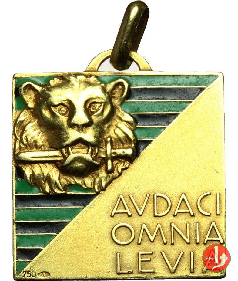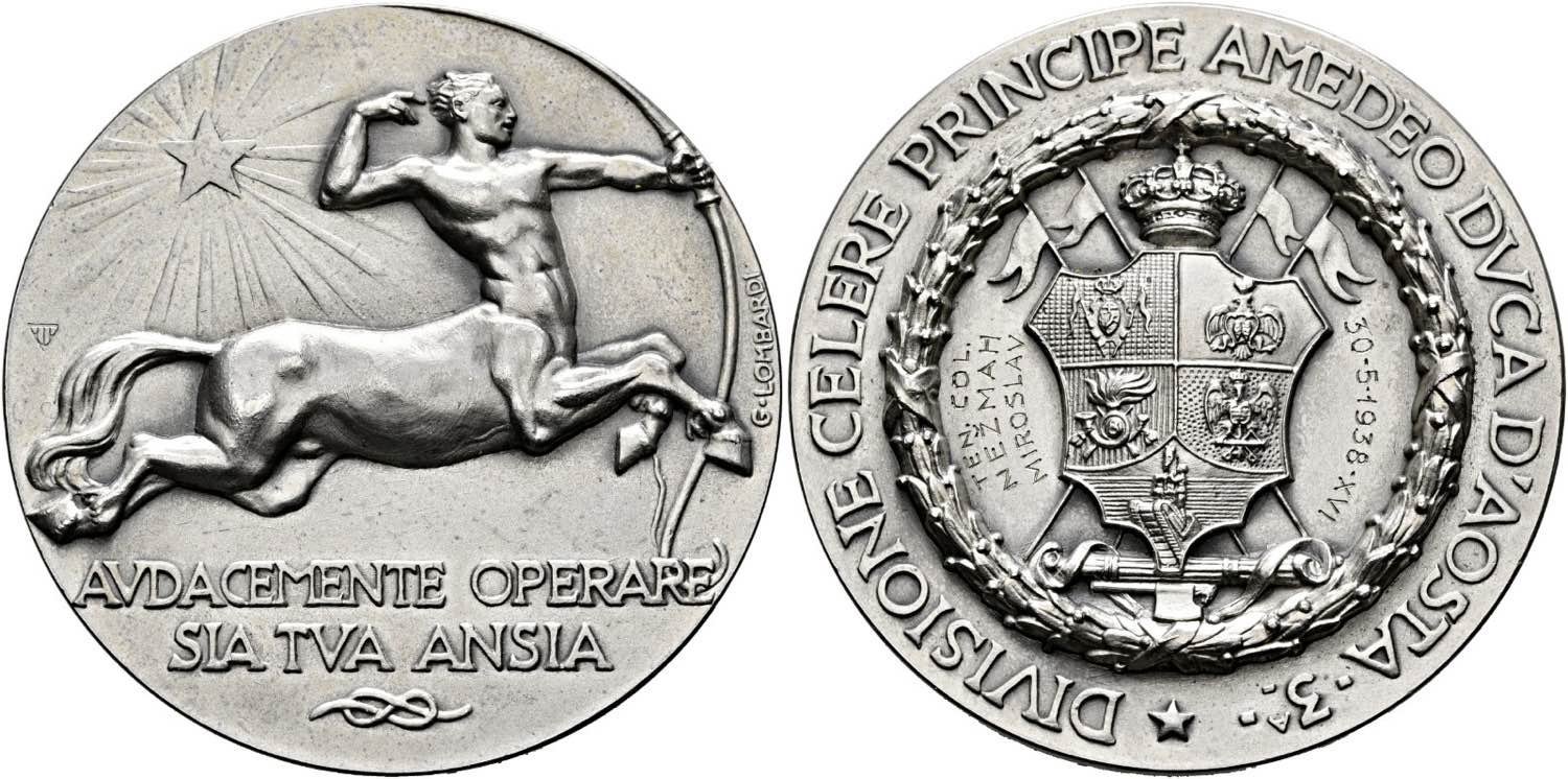 Divisione Celere Principe Amedeo -C85 Dritto: centauro con arco teso verso a dx irraggiato da stella sx sotto: AVDACEMENTE OPERARE = SIA TVA ANSIA = nodo d'amore a dx presso il bordo: G. LOMBARDI entro ghirlanda d'alloro: stemma coronato tra quattro gagliardetti su fascio orizzontale | |