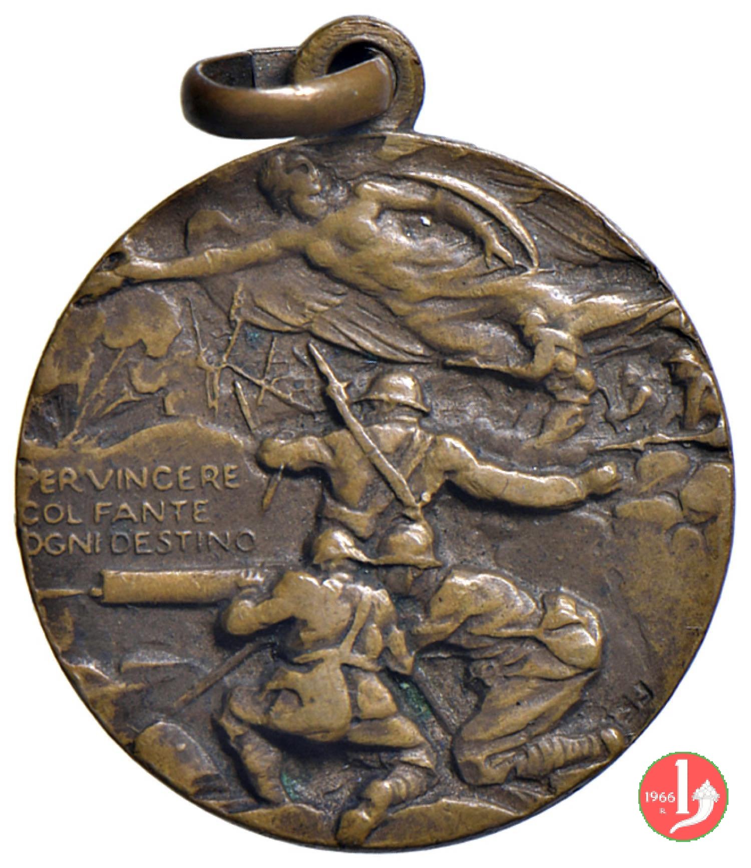 Scuola Centrale di Fanteria Civitavecchia -C- Dritto: La Vittoria alata regge serto d'alloro e sorvola fanti impegnati in battaglia nel campo a sx: PER VINCERE = COL FANTE = OGNI DESTINO in basso a dx: SJ campo vuoto per dedica, contornato da cerchio perlinato e in basso lo Stemma Savoia coronato tra fasci verticali | |
