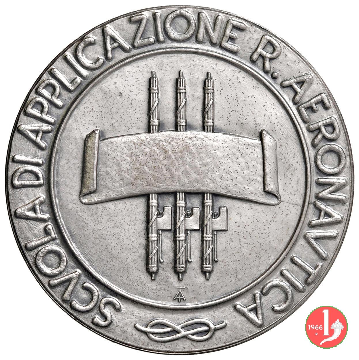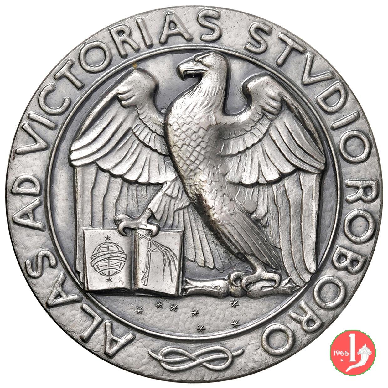 Scuola Applicazione Regia Aeronautica -C- Dritto: ALAS AD VICTORIAS STVDIO ROBORO ![]() ![]() entro cerchio continuo: Aquila ad ali spiegate volta a sx, regge con artigli libro aperto con astrolabio in esergo: stelle cartiglio su tre fasci verticali in basso monogramma: TA | |