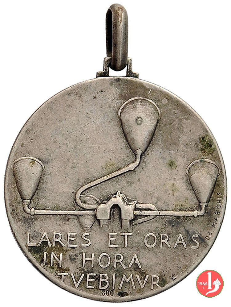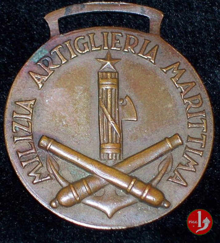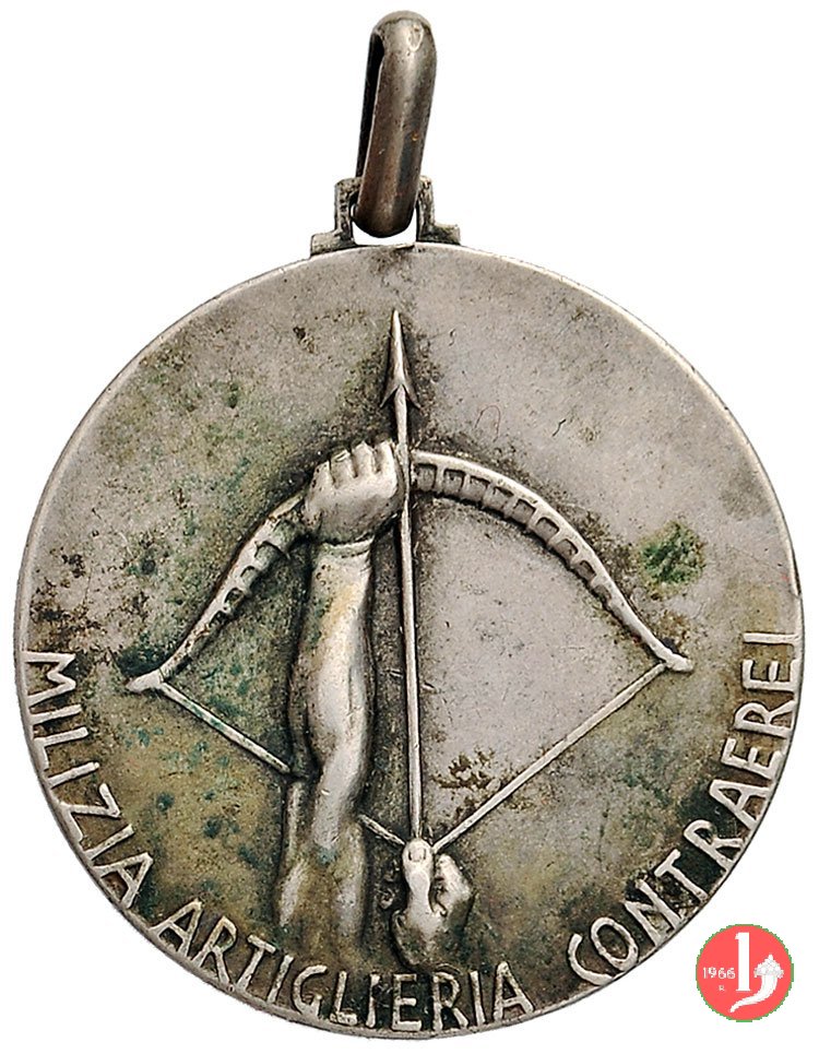 Milizia Artiglieria Contraerei -C- Dritto: in basso, circolarmente: MILIZIA ARTIGLIERIA CONTRAEREI arco teso verso l'alto in basso: LARES ET ORAS = IN HORA = TVEBIMVR a dx, presso il bordo: DE MARCHIS | |