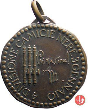 Divisione Camicie Nere -C55 Dritto: DVX _ ITALORVM testa di Mussolini a dx nel campo, a sx tre fasci verticali e a dx legenda corsiva firmata M. | |