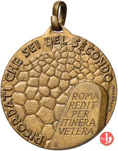 Casa del Soldato Roma -C117 Dritto: tra rami d'alloro: stella raggiante su Aquila Savoia ad ali spiegate di fronte su Stemma Savoia, fascio verticale con lama a dx e resti archeologici Verso: targa legionaria su gladio e tra nodi d'amore CASA DEL SOLDATO DI ROMA | |