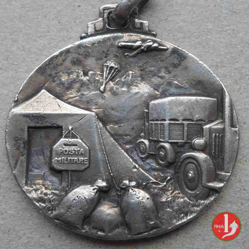 Regio Esercito Italiano - Posta Militare -C121 Dritto: accampamento militare con due autocarri, tre sacchi e aereo in volo che recapita sacco postale con paracadute sullo sfondo: montagne sui sacchi: POSTE ITALIANE entro targa sulla tenda: POSTA = MILITARE fregio del Corpo tra due fasci a lame divergenti sotto: S A. PAGANI - MILANO | |