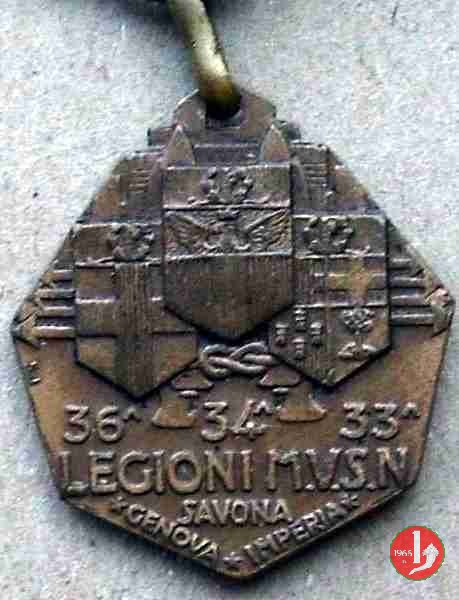M.V.S.N. - 36° 34° 33° Legione -C56 Dritto: tre stemmi affiancati e parzialmente sovrapposti su saette sotto: nodo d'amore in basso: 36° _ 34° _ 33° = LEGIONI MVSN = SAVONA = GENOVA _ IMPERIA in basso, a dx: 7° BATT. = MITRAGLIERI CC.NN. = 2° DIVISIONE CC.NN. = 28 OTTOBRE a sx, presso il bordo: S.J | |