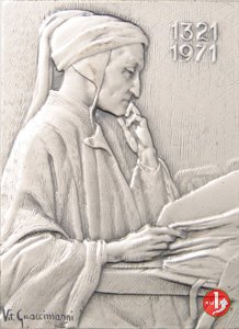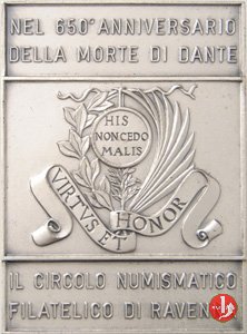 650° morte di Dante 1971 Dritto: Dante seduto verso dx intento alla lettura nel campo, in alto a dx: 1321 = 1971 in basso,a dx: VIT. GUACCIMANNI nel campo, entro medaglia tra rami di alloro e palma: HIS = NONCEDO = MALIS sotto, entro nastro: VIRTVS ET _ HONOR in basso, entro riquadro: IL CIRCOLO NUMISMATICO = FILATELICO DI RAVENNA |