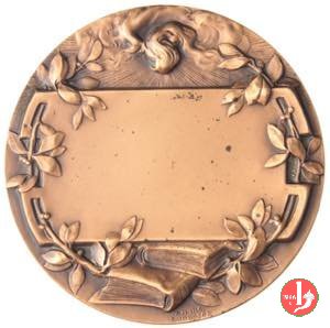 Scuola Superiore di Arte Applicata 1884 Dritto: figura femminile alata con stella in fronte, in piedi, di fronte, regge torcia ardente e lascia cadere serto d'alloro presso lo Stamma della Città di Milano tra manufatti d'artigianato: piatto, vaso e scrigno in basso, a sx: L. POGLIAGHI. INV. A. CAPPUCCIO. INC. in basso, a dx: MDCCCLXXXIV entro ghirlanda d'alloro sormontata da caduceo: targa ornata da perle  | |
