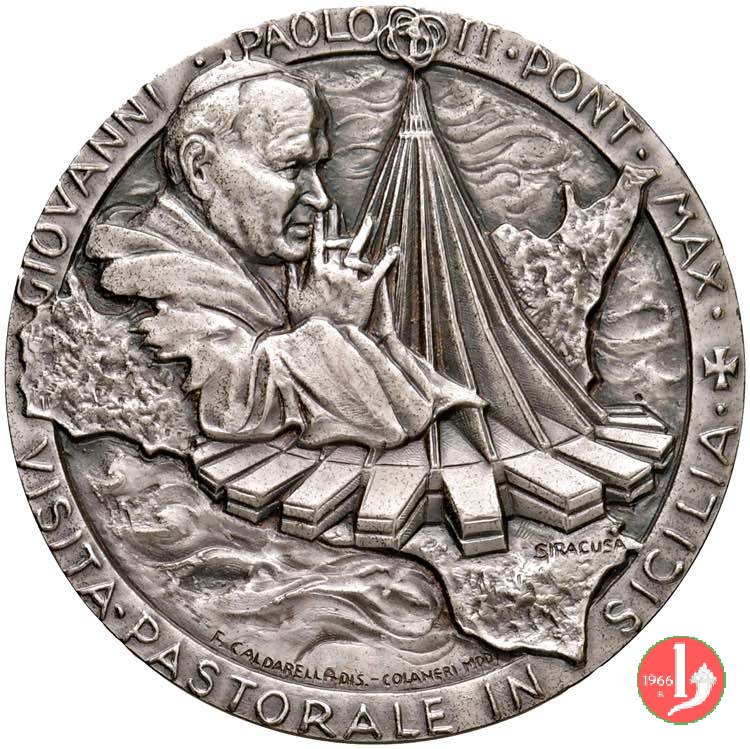 Visita a Siracusa 1994 Dritto: GIOVANNI • PAOLO _ II • PONT • MAX = VISITA - PASTORALE IN SICILIA ✠ Busto del Papa orante a dx presso la Cattedrale Santuario di Santa Maria delle Lacrime sovrapposta alla planimetria dell'isola con evidenziata la città di Siracusa in basso presso il bordo: F. CALDARELLA DIS. COLANERI MOD. Vescovo con mitra e pastorale in piedi e sullo sfondo Piazza San Pietro con la basilica Vaticana tra rami d'alloro in basso a sx: COLANERI in basso sul bordo: IPZS |