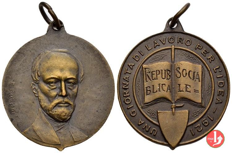 Giuseppe Mazzini 1921 Dritto: busto di fronte con giacca e foulard avvolto al collo a sx presso il bordo: G. Picchiani entro cornice circolare interrotta: vanga verticale su libro aperto su cui REPUB = BLICA _ COCIA = LE= |