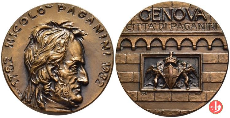 Nicolò Paganini 1982 Dritto: 1782 NICOLÒ PAGANINI 1982 busto a dx in basso a sx: MABA particolare della Lanterna con lapide rettangolare recante lo stemma della città sorretto da grifoni sotto a sx: CDF _ ITALY |