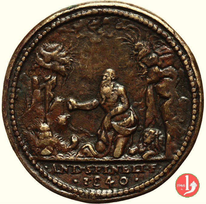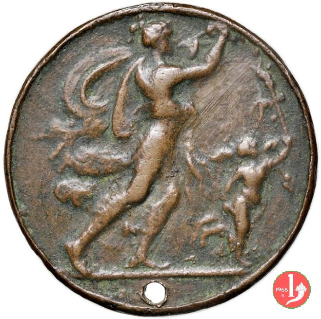 Vincenzo Dolcè -V306 Obverse: IO • VIN • DVLCIVS • IVR • CON • CAN • PATAVIN • AETA • LVI busto a sx con barba, camicia e mantello Genio, in piedi, di fronte, presso ara ardente, regge delfino e protende patera sull'ara in esergo: GENIO | |