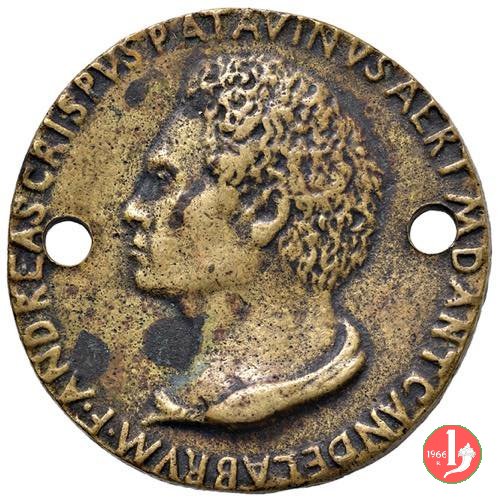 Andrea Briosco -V281 Obverse: ANDREAS • CRISPVS • PATAVINVS • AEREVM • D • ANT • CANDELABRVM • F • busto a sx con capelli riccioluti Albero d'alloro spezzato, con ramoscello germogliato alla base e sormontato da stella ad otto punte |