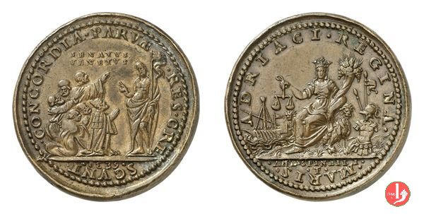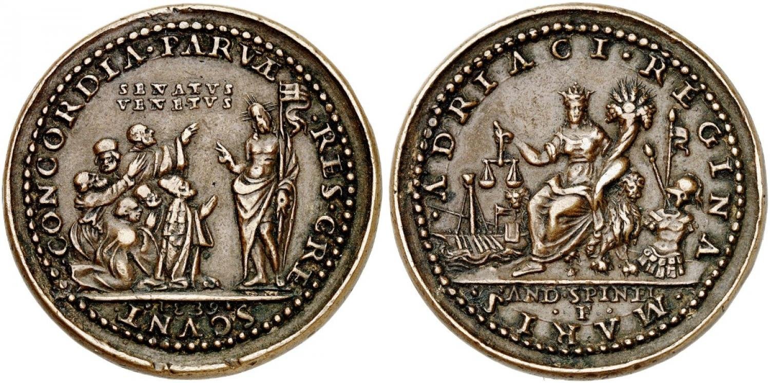 Elezione di Pietro Lando -V314 Obverse: • CONCORDIA • PARVAE _ • RES • CRE _ SCVNT • Gesú Risorto, in piedi, a dx benedice il Doge genuflesso e altre cinque figure oranti in esergo: • 1539 • Figura allegorica di Venezia seduta verso sx, regge bilancia e cornucopia, a dx trofeo d'armi, a sx imbarcazione in esergo: • AND • SPINELLI • |