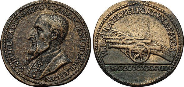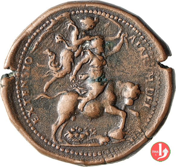 Guido Rangone -V311 Obverse: GVIDVS RANGONVS BELL PACEQ INSIGNIS busto a dx con mantello figura femminile cavalca toro verso dx, regge scettro ed è laureata da genio alato |