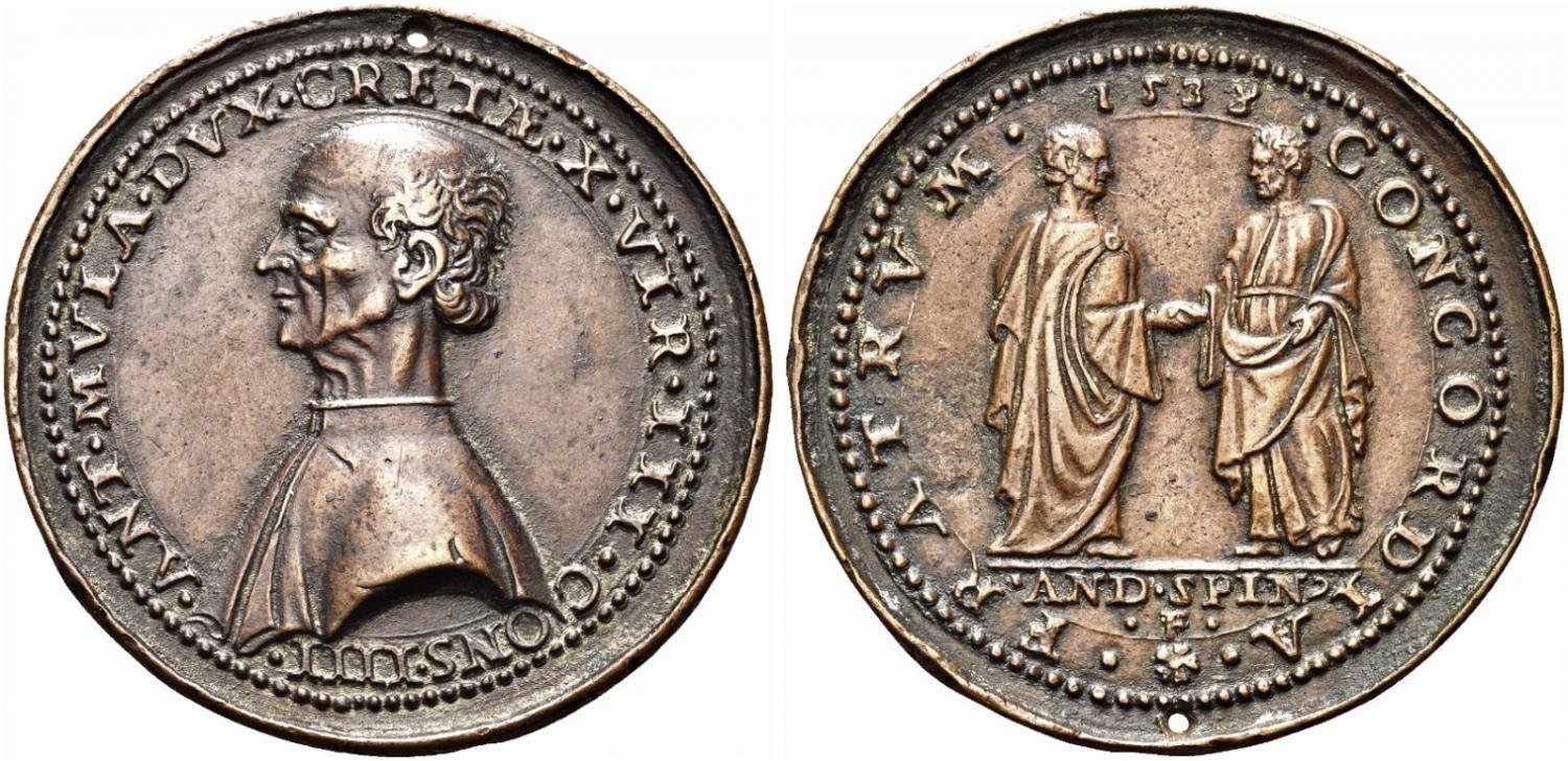Antonio da Mula 1538 -V302 Obverse: _ • ANT • MVLA • DVX • CREATE • X • VIR • III • C _ ONS • IIII • busto a sx con tunica Antonio de Mula e Marcantonio Trevisan in piedi con toghe si stringono la mano in esergo: AND • SPIN • = • F • |