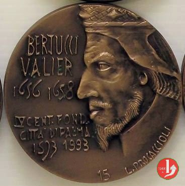 Palmanova - ANP 400° Fondazione Palmanova 1993 Obverse: busto a sx di Bertuccio Valier con corno e manto dogale nel campo a sx: BERTUCCI = VALIER = 1656 1658 = IV CENT. FOND. = CITTA' DI PALMA = 1593 1993 in basso a dx: 15 C. PROCACCIOLI Vista della Città sormontata dal Leone di San Marco a sx, coronato da corno dogale, regge Stemma della Città |