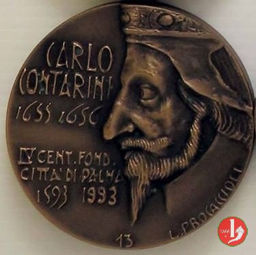 Palmanova - ANP 400° Fondazione Palmanova 1993 Obverse: testa a sx del Doge Contarini con corno dogale nel campo, a sx: CARLO = CONTARINI = 1655-1666 IV CENT. FOND. = CITTA' DI PALMA = 1593 1993 sotto la testa: 13 C. PROCACCIOLI Leone alato di S. Marco regge Stemma di Palmanova sul profilo grafico della città entro cartiglio |