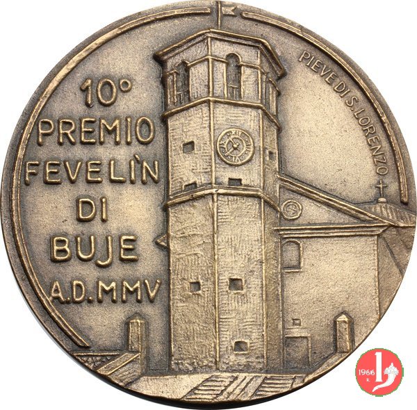 Buja - 10° Premio Fevelin di Buje 2005 Obverse: PIEVE DI S. LORENZO Vista della Pieve con la Torre campanaria nel campo a sx: 10°° = PREMIO = FEVELIN = DI = BUJE = A.D. MedagflMMV Stemma turrito di Buja aon fondo in smalti blu sormonta logo della Società Operaja di Mutuo Soccorso ed Istruzione in medaglia (mani che si stringono su bandiera tricolore a smalti) in basso a dx: P. MONASSI |
