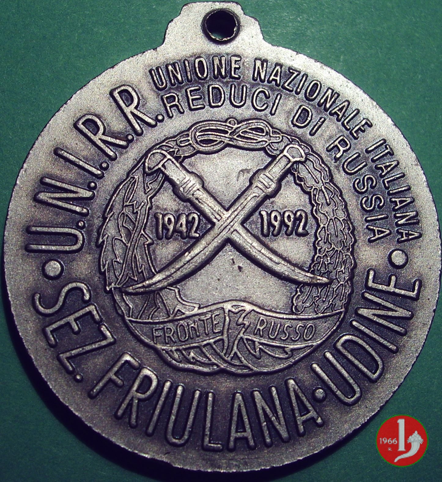 Cargnacco - Tempio del Soldato Ignoto 1992 Obverse: TEMPIO DEL SOLDATO IGNOTO Prospetto anteriore del fabbricato nel campo a dx verticalmente: DIS = A. TABOGA in esergo: CARGNACCO = • UDINE • Logo dell'Unione Reduci di Russia: sciabole cosacche su ghirlanda d'alloro 1942 _ 1992 ed entro nastro alla base FRONTE RUSSO |