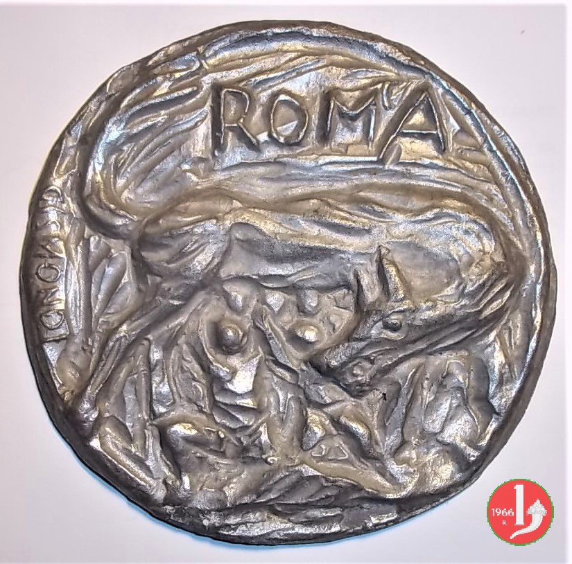 Esposizione Campionaria Mondiale Roma 1901 Obverse: figura allegorica dell'Italia elmata e seduta verso sx, regge asta e cartiglio e si appoggia ad ara e a scudo, dietro la Lupa in esergo: SPALLETTA Stella raggiate sormonta campo vuoto per dedica tra rami d'alloro e quercia legati in basso da nastro |