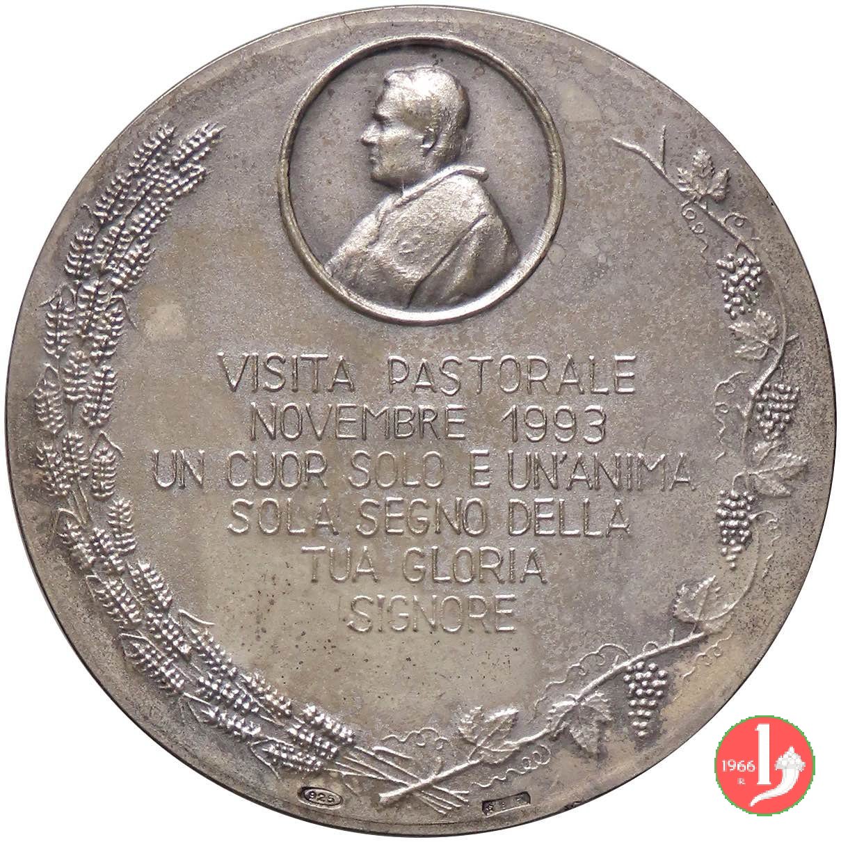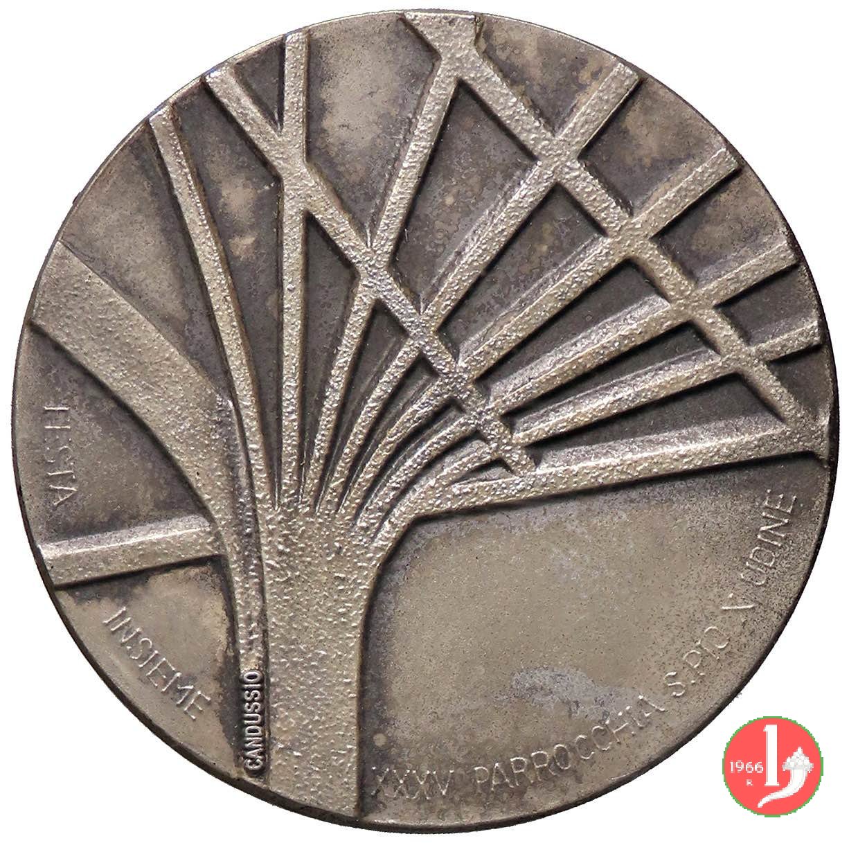 35° Parrocchia San Pio X di Udine 1993 Obverse: in basso circolarmente: FESTA _ INSIEME _ XXXV PARROCCHIA S. PIO X UDINE composizione con albero geometrico (particolare strutturale dell'architettura interna della Chiesa San Pio X di Udine) in basso sul pilastro in verticale: CANDUSSIO sotto, entro rami di spighe di grano e tralci d'uva: VISITA PASTORALE = NOVEMBRE 1993 = UN CUOR SOLO E UN'ANIMA = SOLA SEGNO DELLA = TUA GLORIA = SIGNORE |