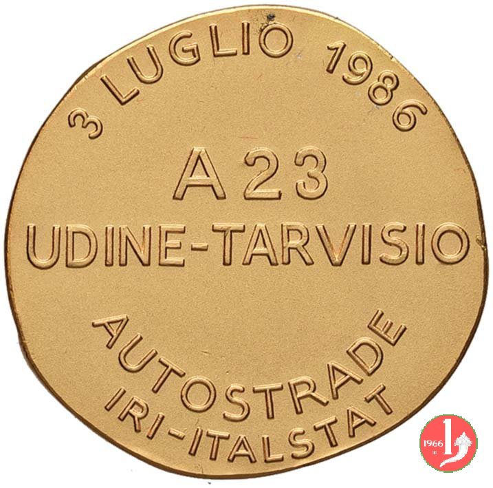 Autostrada A23 Udine-Tarvisio 1986 Obverse: figura allegorica: busto di giovane volto a sx con testa raggiante in basso sul busto: GRECO nel campo: A 23 = UDINE-TARVISIO in basso circolarmente: AUTOSTRADE = IRI-ITALSTAT |