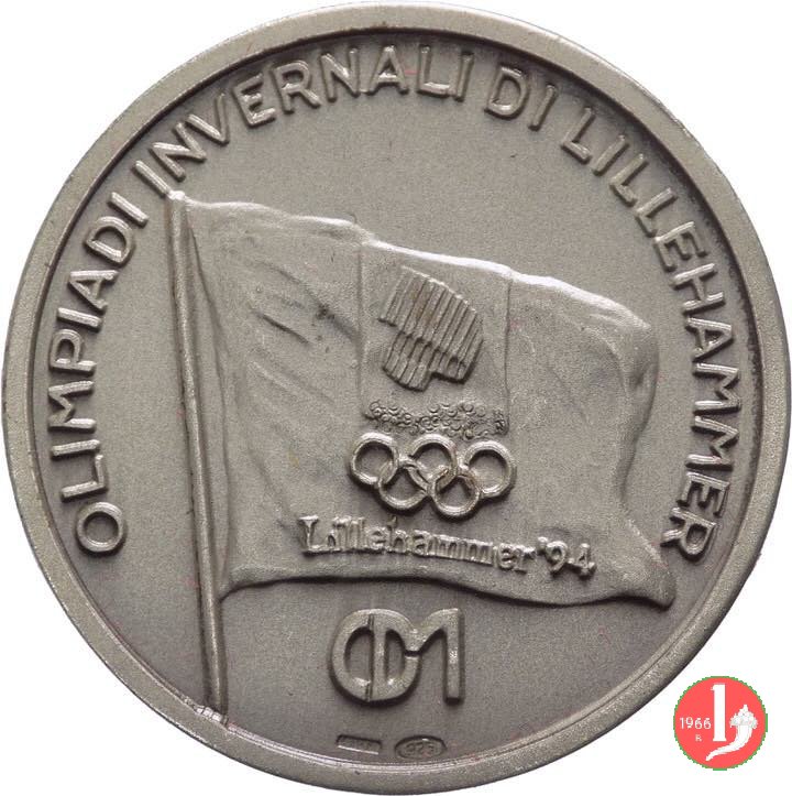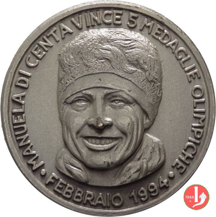Manuela Di Centa 1994 Obverse: MANUELA DI CENTA VINCE 5 MEDAGLIE OLIMPICHE = • FEBBRAIO 1994 • busto di fronte con cuffia bandiera delle Olimpiadi di Lillehammer sotto: CDM |