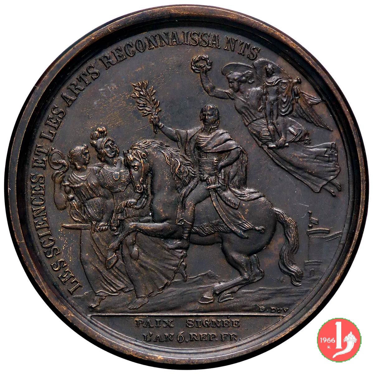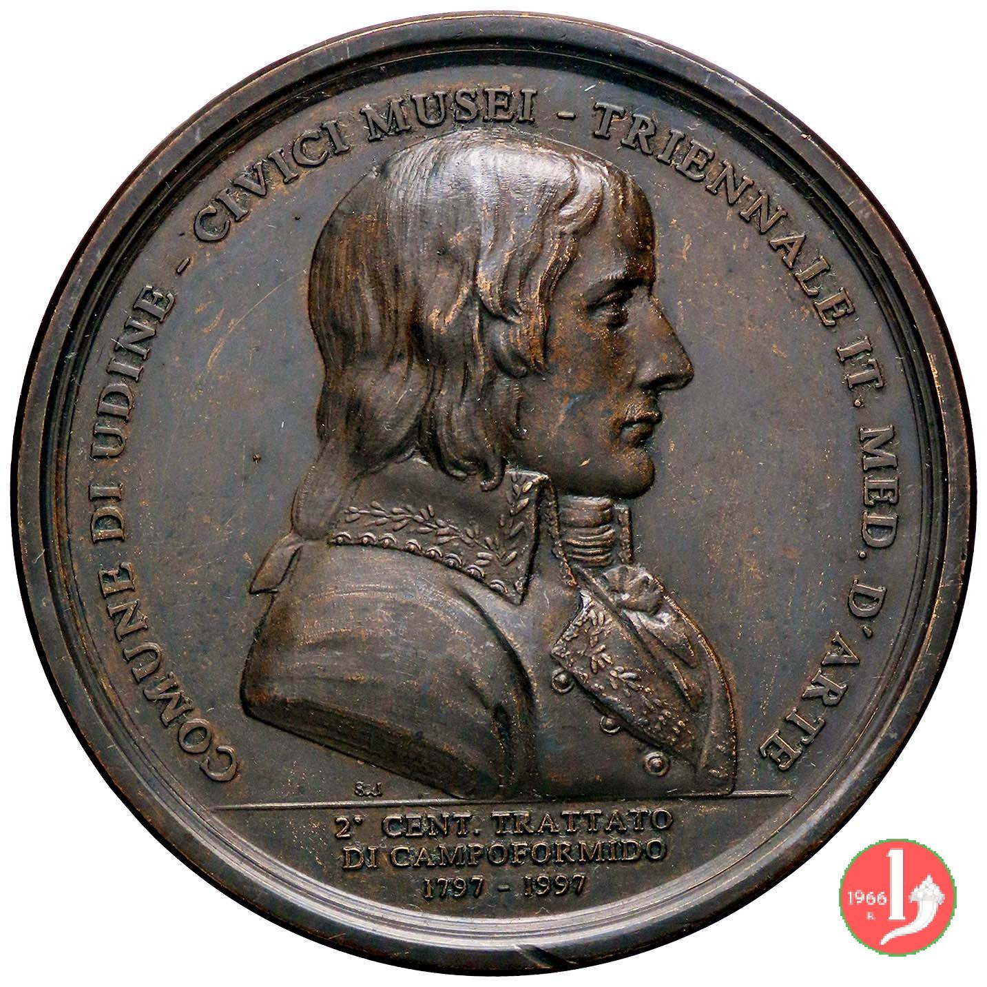 200° Trattato di Campoformio 1997 Obverse: COMUNE DI UDINE - CIVICI MUSEI - TRIENNALE IT. MED. D'ARTE busto di Napoleone a dx con divisa ricamata sotto a sx: S.J in esergo: 2° CENT. TRATTATO = DI CAMPOFORMIO = 1797-1997 Napoleone su cavallo rampate a sx, protende ramo d'ulivo e ai lati le figure allegoriche della scienza (Minerva paludata in volo, regge serto d'alloro e statua delle vittoria alata) e delle arti in basso a dx: B. DUV in esergo: PAIX SIGNEE = L'AN. 6 REP. FR. |