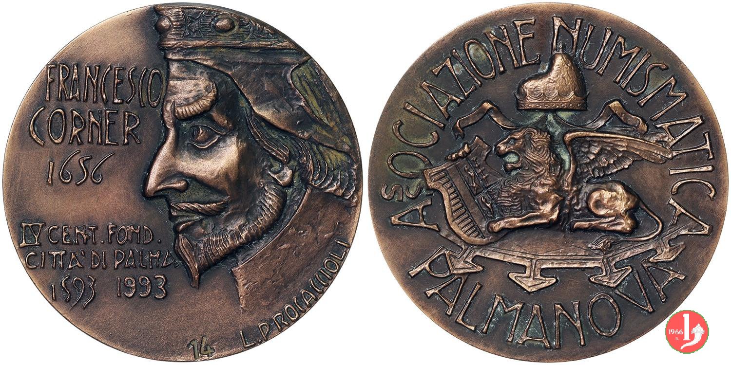 Palmanova - ANP 400° Fondazione Palmanova 1993 Obverse: testa a sx del Doge Contarini con corno dogale nel campo, a sx: FRANCESCO = CORNET = 1656 = IV CENT. FOND. = CITTA' DI PALMA = 1593 1993 sotto la testa: 14 C. PROCACCIOLI Leone alato di S. Marco regge Stemma di Palmanova sul profilo grafico della città entro cartiglio |