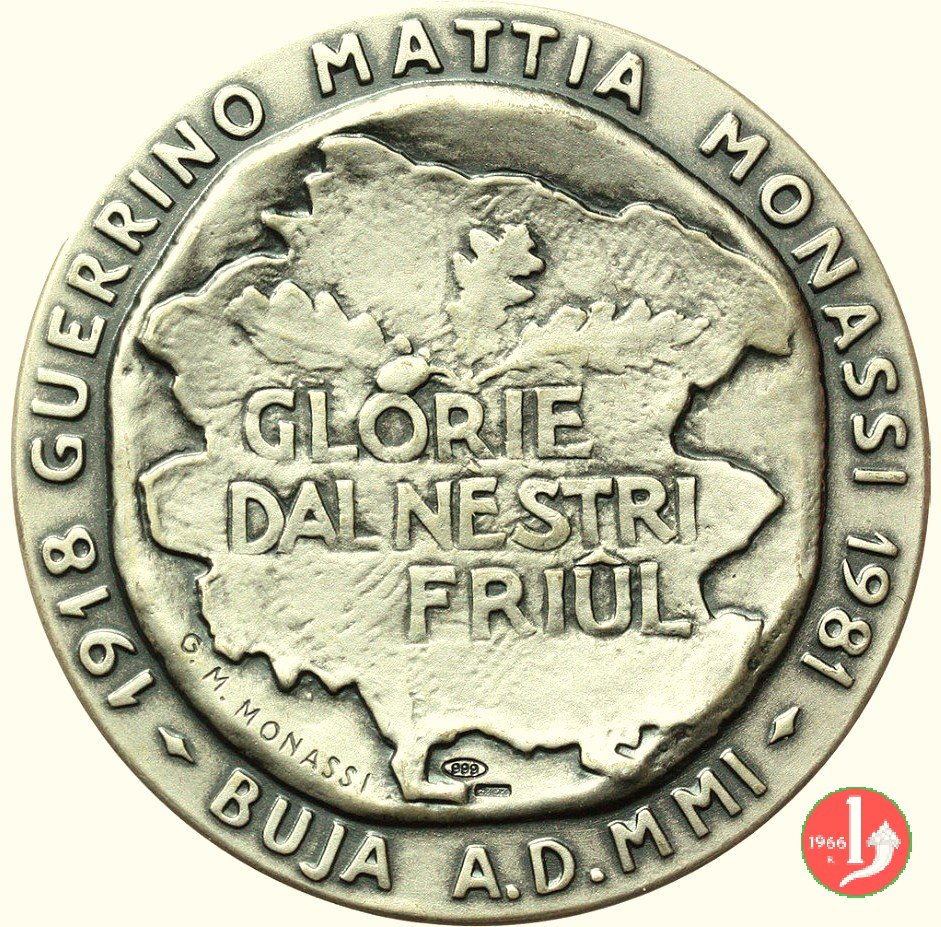 Buja - Guerrino Mattia Monassi 2001 Obverse: testa di 3/4 a dx in basso, a dx: DRIUTTI = 1973 nel campo: planimetria del Friuli con foglie di quercia GLORIE = DAL NESTRI = FRIUL in basso, a sx: G. M. MONASSI |