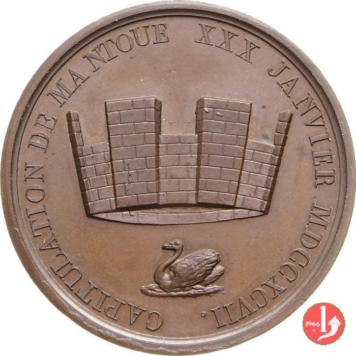 Presa di Mantova 1796 -H785 Obverse: Figure allegoriche in piedi in basso,a dx, sulla linea dell'esergo: LAVY in esergo: REDDITION DE = MANTOUE sotto: A L'ARMEE D'ITALIE = VICTORIEUSE = fascio di fulmini = LOI = DU 24 • PLUVIOSE = AN • 5 MER |