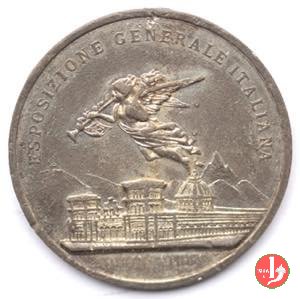 Esposizione Nazionale a Milano Obverse: LABOR _ OMNIA _ VINCIT La figura allegorica dell'Italia turrita con stella raggiante in fronte, regge ramo d'alloro e saluta, tra putti alati e rimira la figura allegorica del lavoro con martello seduta su incudine, morsa e ingranaggio, sullo sfondo a sx veliero in mare e a dx sore nascente, treno a vapore presso tunnel ferroviario, timone, compasso, tavolozza e pennelli e pergamena sulla linea dell'esergo, a dx: RESTELLI in esergo: RE VMBERTO = AVSPICE |