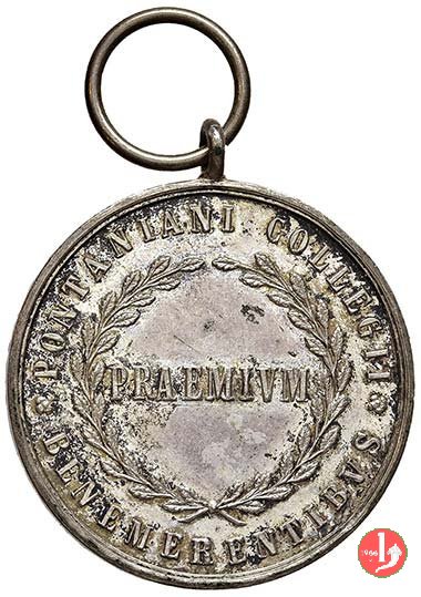 Collegio Prontano Dritto: RELIGIONI ET BONIS ARTIBVS Sfera Armillare tra cartiglio con compassi, squadri e attrezzature per disegnare a sx e lira a dx, entro rami d'alloro nel campo, tra rami d'alloro: PRAEMIVM |