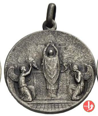 Verso: tra due Angeli genuflessi con turibolI: sacerdote di spalle solleva ostia su altare e sullo sfondo la Cupola della Basilica di San Pietro