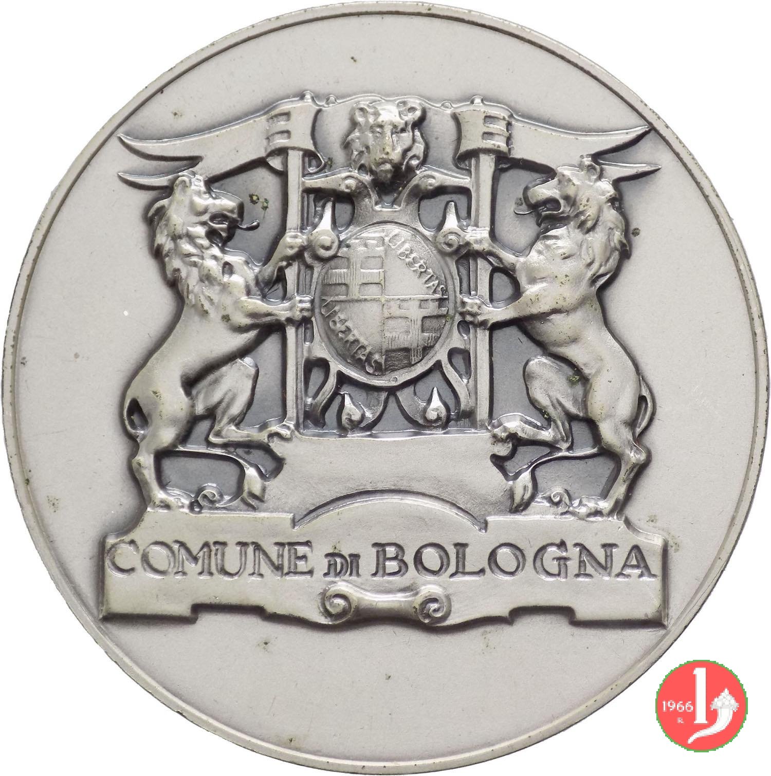 Verso: Stemma del Comune di Bologna tra volute, sorretto da leoni ai lati con stendardi e sormontato da testa leonina, posto su mensola a cartiglio contenete: COMUNE DI BOLOGNA