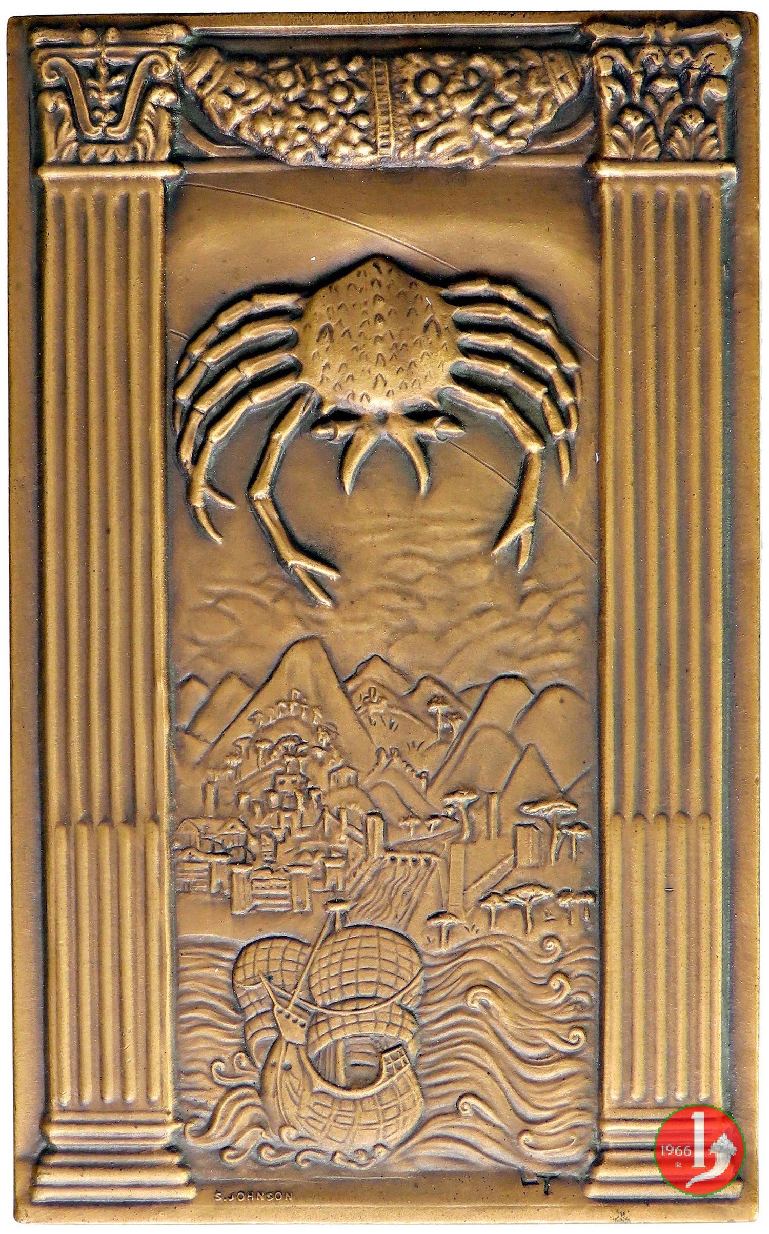 130° Cassa di Risparmio di Cento 1989 Dritto: composizione con gusci e mezzelune in basso, a sx: S. JOHNSON in basso, a dx: S AMELIO = 88 in basso: S AMELIO = 88 | |