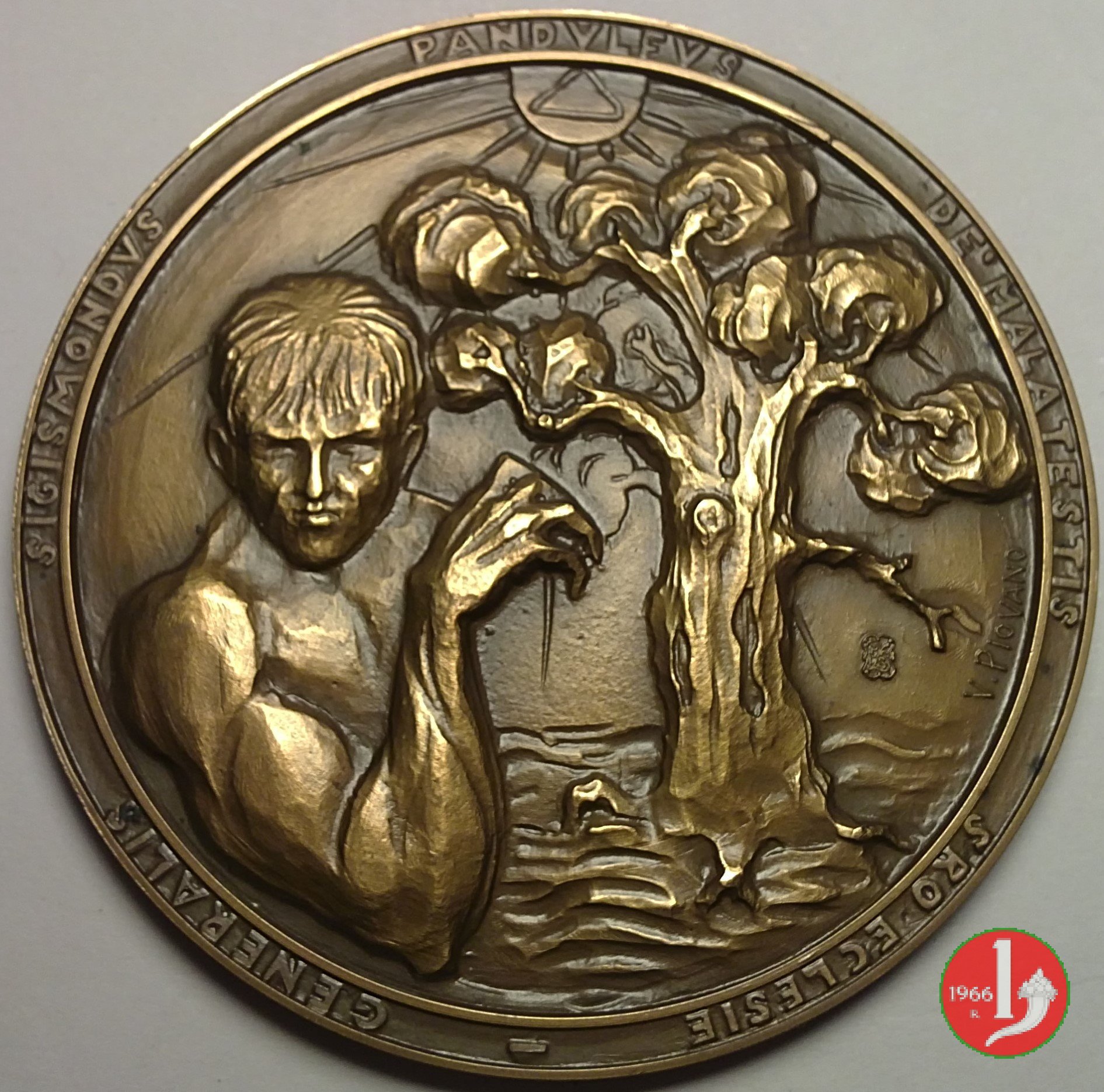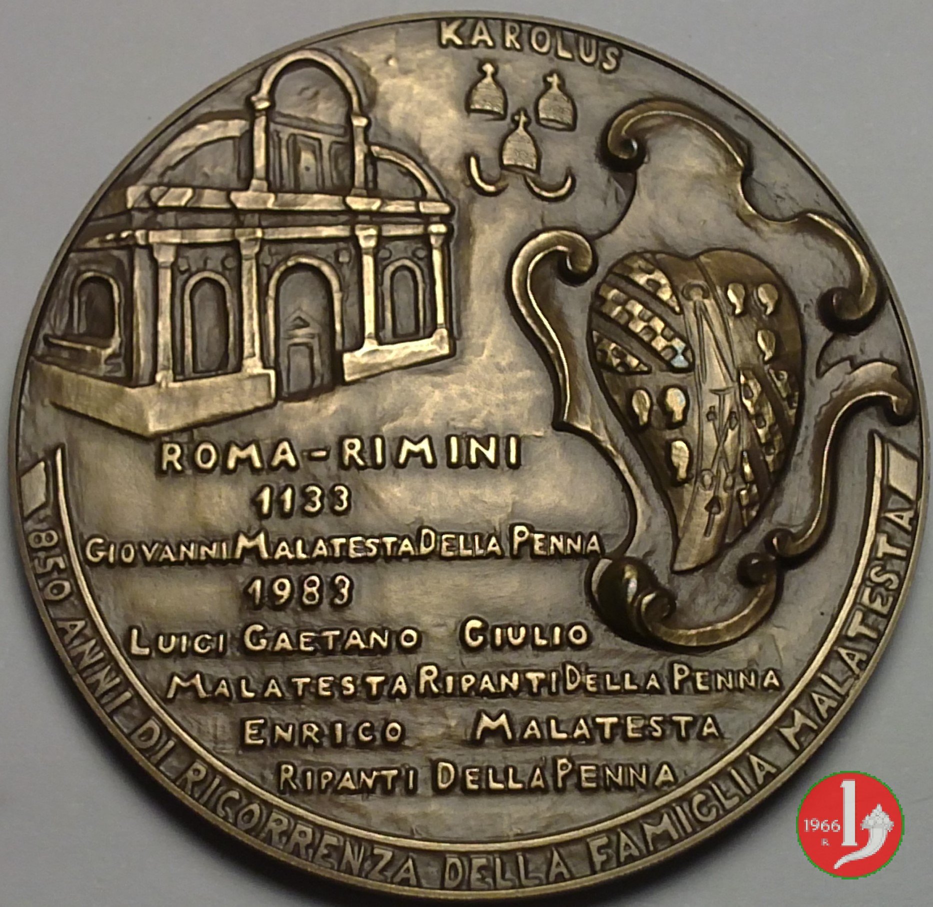 Giovanni Malatesta Della Penna 1983 Dritto: GENERALIS SIGISMONDVS PANDOLFVS DE MALATESTIS SRO ECLESIE - entro cerchio continuo: busto nudo di fronte con albero illuminato da sole a dx, presso il bordo interno: V. PIOVANO Vista del Tempio Malatestiano a Rimini e Stemma Malatesta entro cartiglio nel campo: ROMA - RIMINI = 1133 = GIOVANNI MALATESTA DELLA PENNA = 1983 = LUIGI GAETANO GIULIO = MALATESTA RIPANTI DELLA PENNA = ENRICO MALATESTA RIPANTI DELLA PENNA in basso, circolarmente, entro nastro: 850 ANNI DI RICORRENZA DELLA FAMIGLIA MALATESTA |