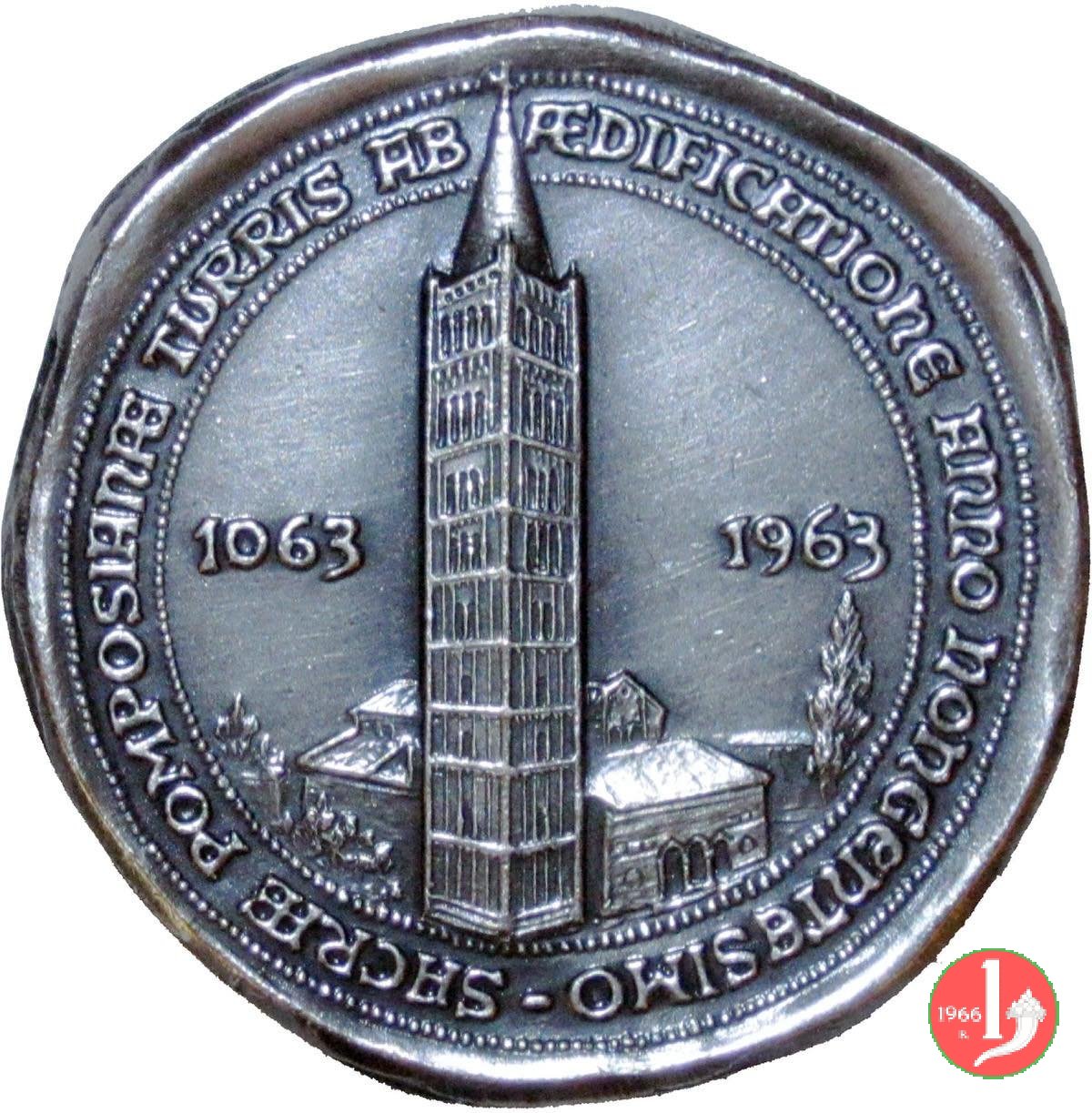 Codigoro - 900° Campanile Abbazia di Pomposa 1963 Dritto: SACRÆ POMPOSIANÆ TURRIS AB – ÆDIFICATIONE ANNO NONGENTESIMO entro cerchio perlinato interrotto: vista dell'Abbazia di Pomposa, in primo piano la torre del campanile ai lati: 1063 – 1963 entro cerchio perlinato interrotto:Riproduzione di antiche immagini relative all’Abbazia: la B. V. Maria col Bambino Gesú tra due torri e rose in bocciolo su arco con sotto cinque frati oranti |