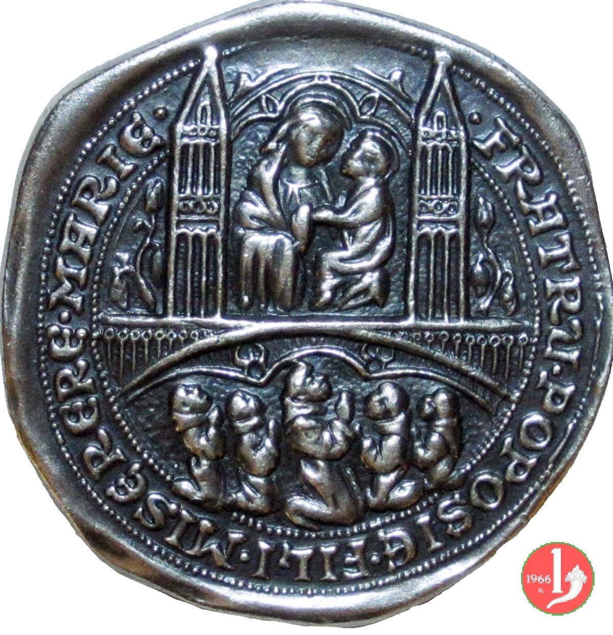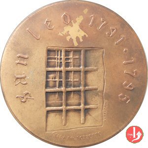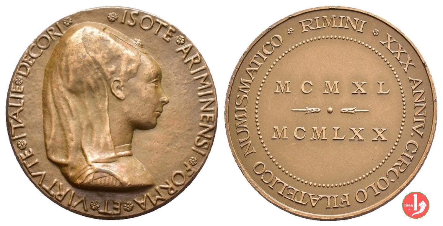 busto di Isotta da Rimini velato e volto a dx (tratto dalla notissima medaglia del Pisanello) entro cornice circolare perlinata: MCMXL = - = MCMLXX |