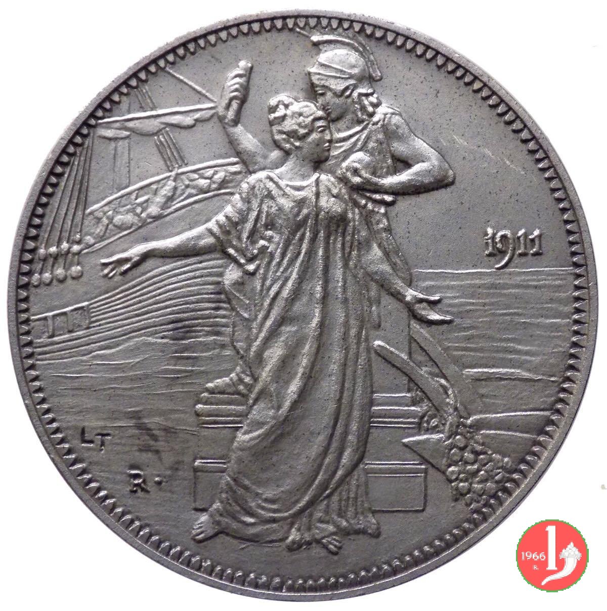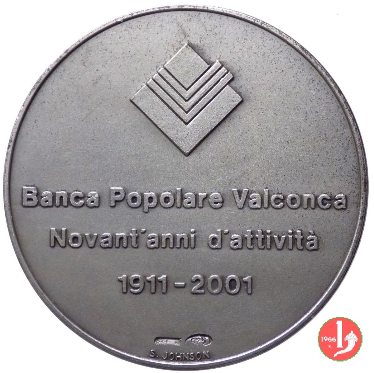 90° Banca Popolare di Valconca 2001 Dritto: riproduzione del dritto della serie di monete emesse nel 1911 per il cinquantesimo anniversario dell'Unità d'Italia: Due figure allegoriche che simboleggiano l'Italia (la figura femminile) e la città di Roma (la figura maschile posta su di un piedistallo al cui lato si intravede un aratro). Sullo sfondo la prora di una nave mercantile. nel campo a dx: 1911 in basso a sx: LT _ R. sotto: BANCA POPOLARE VALCONCA = NOVANT'ANNI D'ATTIVITA' = 1911 - 2001 in basso: S. JOHNSON |
