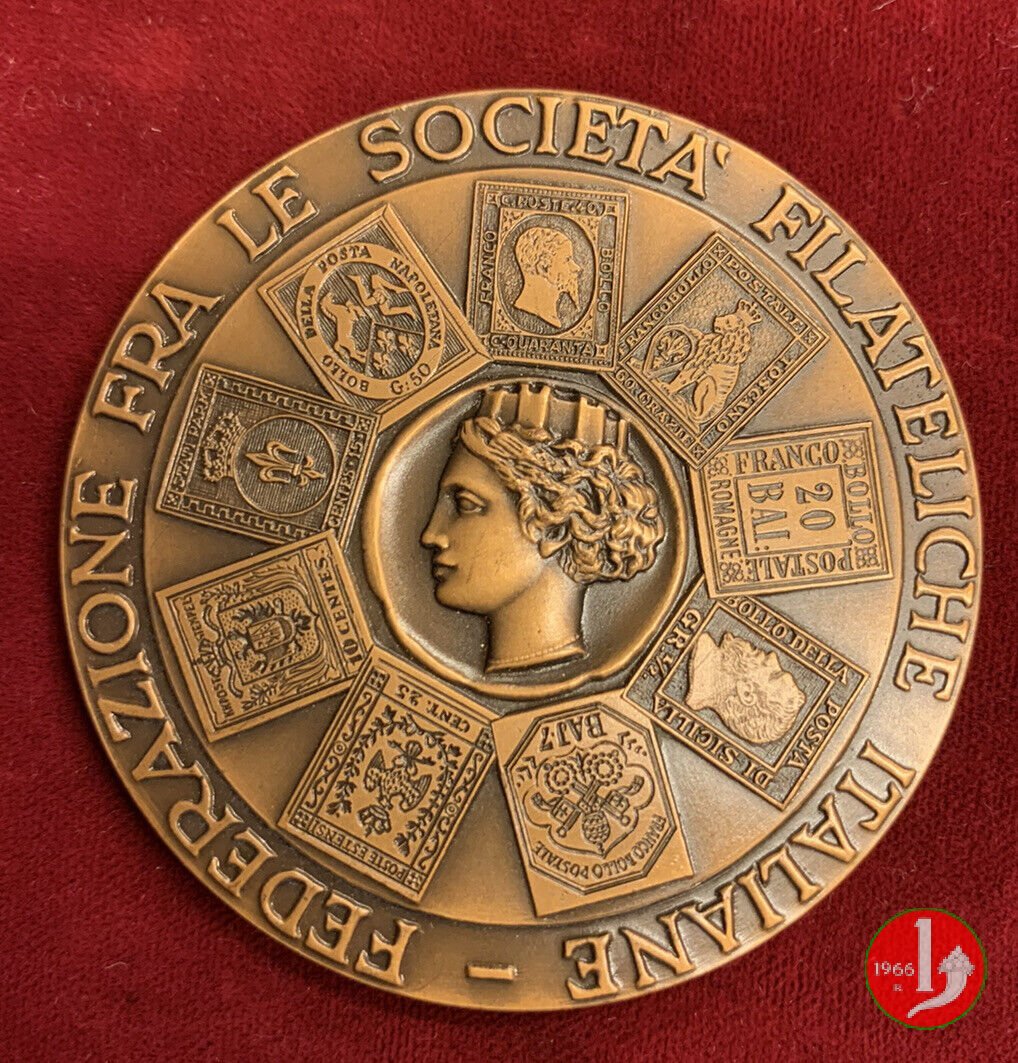 Federazione Società Filateliche Italiane 1969 Dritto: FEDERAZIONE FRA LE SOCIETA FILATELICHE ITALIANE - testa dell'Italia turrita a sx tratta dalla serie detta Siracusana con attorno i nove francobolli rappresentativi degli Antichi Stati Italiani in basso: BERTONI |