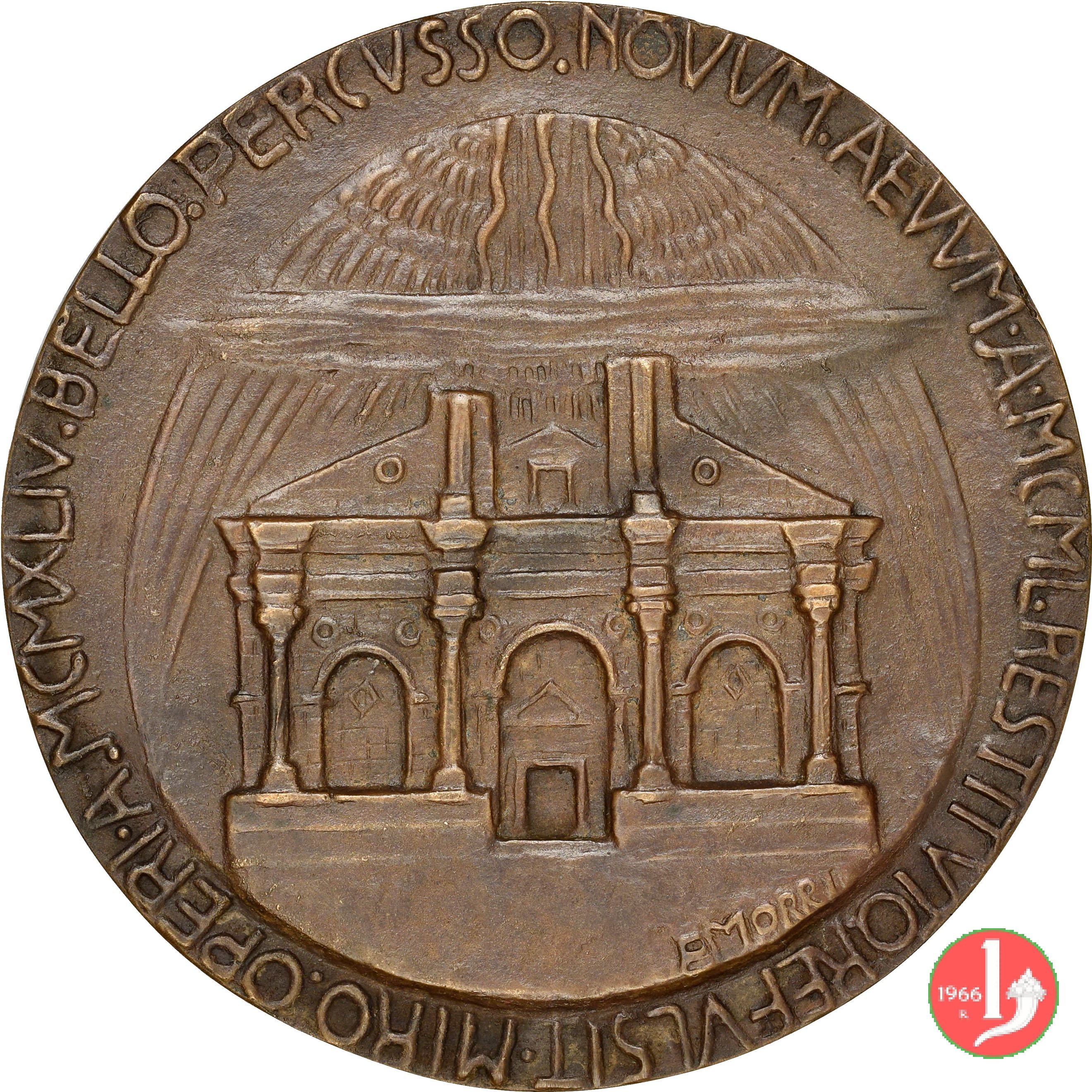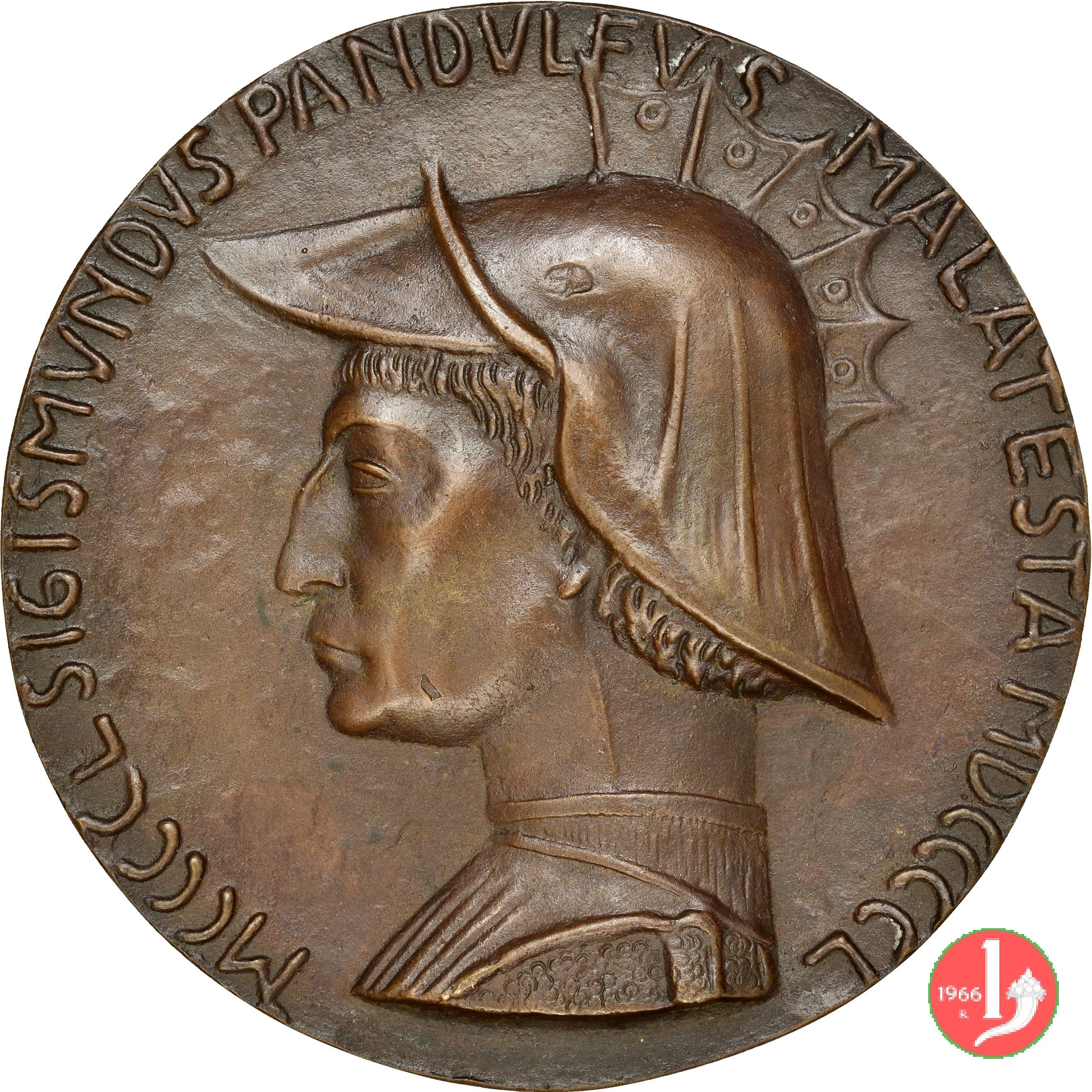 Sigismondo Malatesta 1950 Dritto: MDCCCCL SIGISMVNDVS PANDVLFVS MALATESTA MDCCCCL testa elmata e corazzata a sx Prospetto anteriore del Tempio malatestiano a Rimini irraggiato da fulmine in basso, a dx: E MORRI |