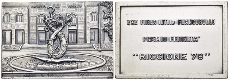 30° Fiera del Francobollo di Riccione 1978 Dritto: Prospetto anteriore del Palazzo del Turismo con la Fontana del Nuotatore In esergo: AZIENDA SOGGIORNO RICCIONE |