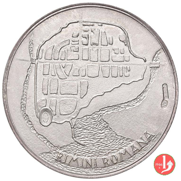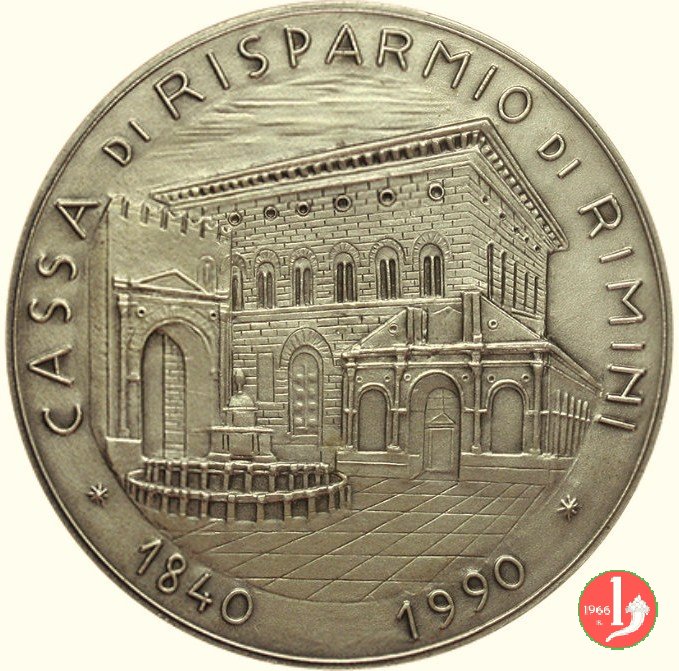 150° Cassa di Risparmio di Rimini 1990 Dritto: MAGNVM VECTIGAL PARSIMONIA Pellicano nutre la prole sotto, a sx: S. JOHNSON a dx: E. MORRI Vista di Monumenti della Città di Rimini: San francesco, l'Arco di Augusto, Fontana della Pigna, Palazzo Buonadrata sede della Cassa di Risparmio |