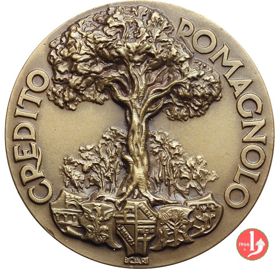 60° Credito Romagnolo 1956 Dritto: CREDITO _ ROMAGNOLO Albero di quercia su stemmi in basso: BOARI tre figure allegoriche di fronte con scrigno ai piedi |