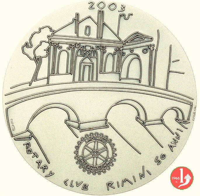 50° Rotary Club 2003 Dritto: cinque figure presso un tavolo a sx, presso il bordo, corsivo: A - D - MMII • a dx, presso il bordo: U RIVA sintesi dei monumenti piú significativi di Rimini sotto: logo del Rotary in basso, circolarmente: ROTARY CLUB RIMINI 50 ANNI a dx, presso il bordo: OMEA - MI |