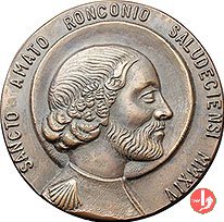 Saludecio - Sant' Amato Ronconi 2014 Dritto: SANCTO AMATO RONCONIO SALUDICIENSI MMXIV busto nimbato a dx Vista di edificio sotto, a sx: PEDINI • T • |
