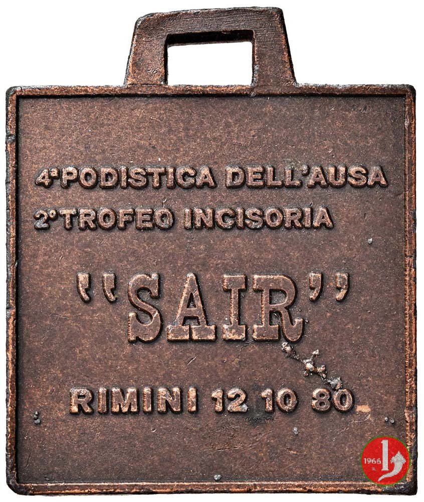 Gara podistica dell'Ausa 1980 Dritto: Vista dell'Arco di Augusto Verso: nel campo: 4° PODISTICA DELL'AUSA = 2° TROFEO INCISORIA = "SAIR" = RIMINI 12 10 1980 |